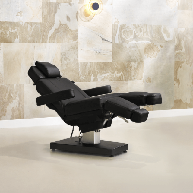 De aluminium voet maakt het mogelijk om verticaal omhoog en omlaag te gaan, hierdoor neemt de stoel minder ruimte in dan vergelijkbare behandelstoelen met een hefboomsysteem. De stoel is uitermate geschikt voor schoonheid en pedicure behandelingen.