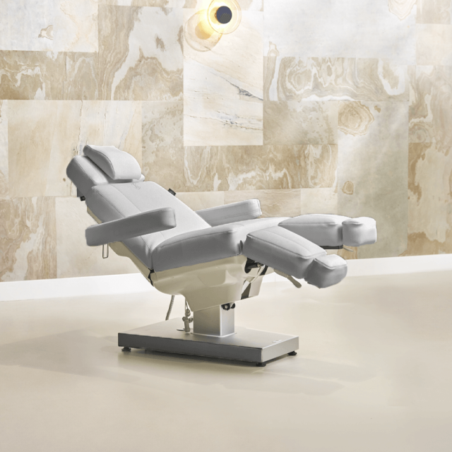 De aluminium voet maakt het mogelijk om verticaal omhoog en omlaag te gaan, hierdoor neemt de stoel minder ruimte in dan vergelijkbare behandelstoelen met een hefboomsysteem. De stoel is uitermate geschikt voor schoonheid en pedicure behandelingen.